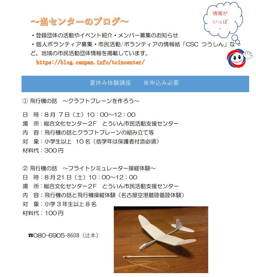 内 容:飛行機の話とクラフトプレーンの組み立て等